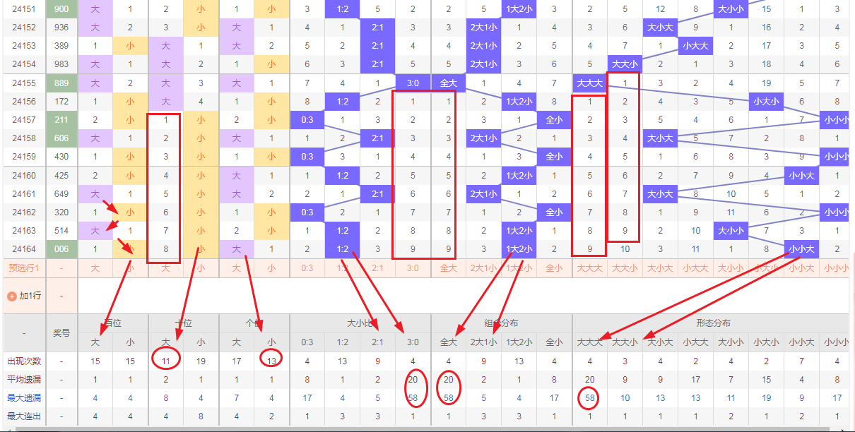 排列三 大小形态分析:从大小走势图上可以看出排列三100期内百位大小比为48比52,十位大小比为55:45,个位大小比为54比46除了个位和十位奇数比偶数多,百位是偶数比奇数多。历史数据近2期开出小小大后下一期的走势为,第126期开出小小大第127期开大大小。第134期开出小小大后第135期开小大小,第142期开出小小大后144期开大大大。可以看出开出小小大形态后形态转变过快,不过还是能看出开出小小大形态后下一期还是比较规律的进行切换,这时遗漏数据就显示作用的时候,结合遗漏数据再加上开出小小大形态后容易进行下一个类型变化。所以排列三第165期大小形态推荐大大小防大大大。