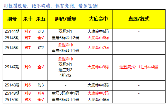 免费版仅开放大底号码和部分杀号, 更多杀号、胆码发布在会员专区。
