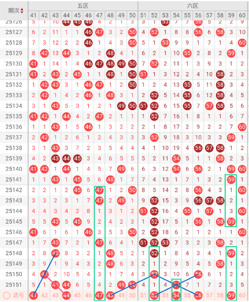 六区开出:54 奇偶比: 0:1 和值:54 跨度:0,上期开出1个号码,偶数。本期无三斜连走势,隔码斜连走势:52 56。近5期出号量:4-2-1-2-1,近10期平均出号3枚,上期奇偶比:0:2,本期推荐关注号码:52、54、56、59。