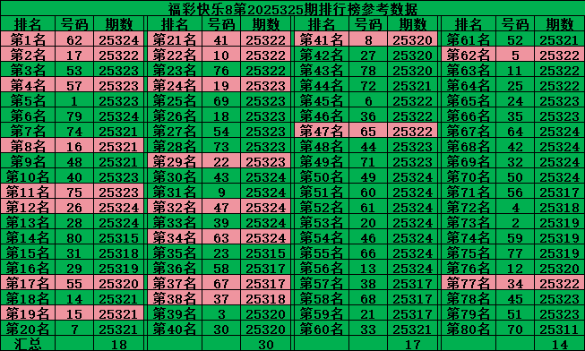 截至2025325期最大遗漏的号码是14期的70号,提取最近14期的数据做为2025326期的参考数据: