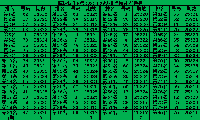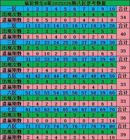 最后再把号码分为四区:一区01-20号、二区21-40号、三区41-60号、四区61-80号,理论上每个区每期应该开出5个号码:
