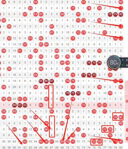 70今日七区号码建议参考62三重,七区后区建议参考66间隔偶连,防65 66 67三连,七区尾部参考70顺位斜连,防69 70 71三连,八区号码建议参考75 76梯形态下号,八区尾部建议参考80,73对应80下号,防79 80对子号开出。今日七区八区推荐号码62 65 66 67 69 70 71 75 76 79 80