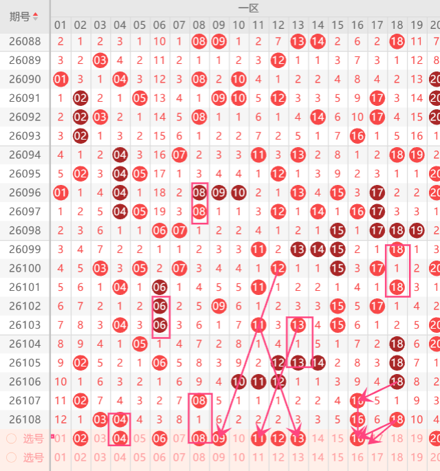 一区在近期的走势分析,近期一区间是一个温热形态,上期一区间开出4码,而且上期区间开出的形态是重码和空位回补走势,上期小妹在文章中布局到了2码开出,那么本期一区间重点关注在重码走势,重码回补,对称形态,首先本期注意04.16.18中选择1码机会,而重码回补上的12.15.20中选择1码回补机会,至于对称形态上的11.13.中参考一码机会,上期重点关注在隔期回补上布局到了1码开出,那么本期重点关注在空位回补上布局一码订胆机会,如图所示