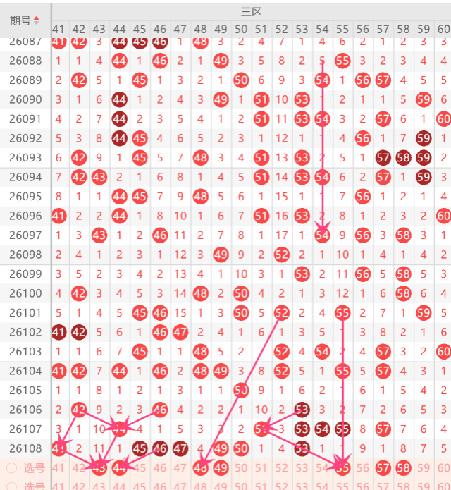 而三区的打底号.43.44.46.49.51.55.57.58中参考3-4码开出机会,