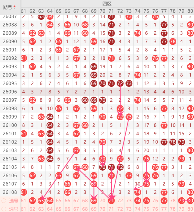 四区在近期的走势上来判断机会的话,整体区间是个走热形态,上期四区间开出了5码,而上期四区间开出的形态是重码和斜连号走势,上期小妹在文章中布局到了3码开出,那么本期四区间我们重点关注的形态是空位回补,重码走势,那么本期首先注意空位回补上的63.71.78中参考一码回补机会,而重码走势上注意74.77.80中选择1-2码走重机会,上期重点关注在对称形态上布局到了2码开出,那么本期重点关注在重码回补上布局一码订胆机会,如图所示