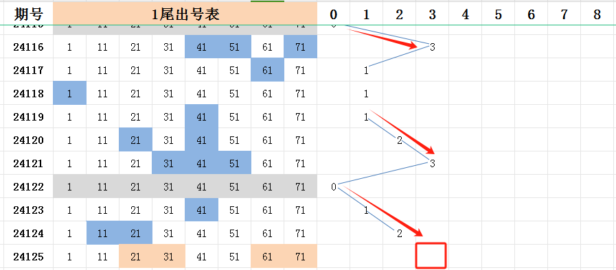 按照号码近期开出的个数走势图表,顺延开出三码走势是常态。再叠加九尾是今年的热尾,更容易走出多码走势,所以可以看四码走势。