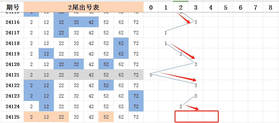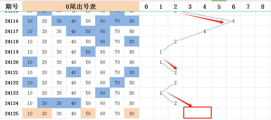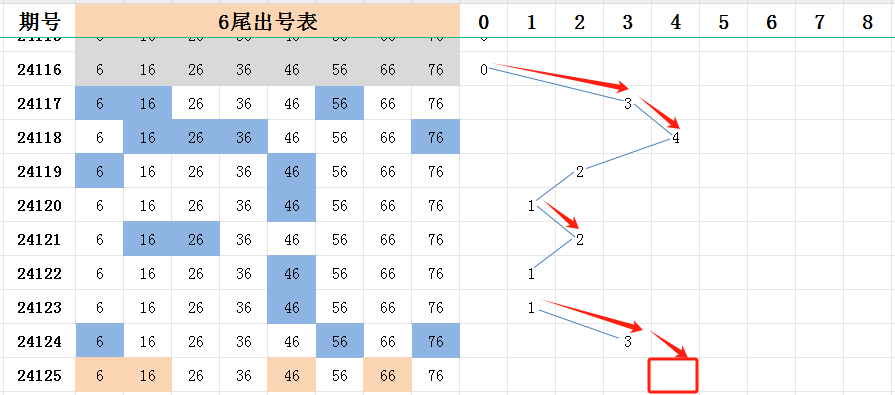 本期六尾的号码个数可以选择复制117期和118期的走势。如果考虑六尾开出多码走势的话,可以前后各选择两个号码。
