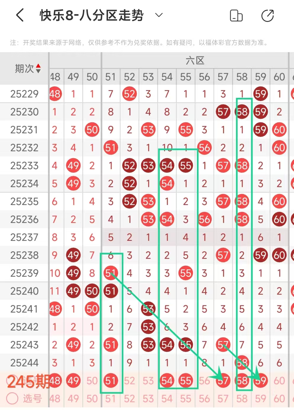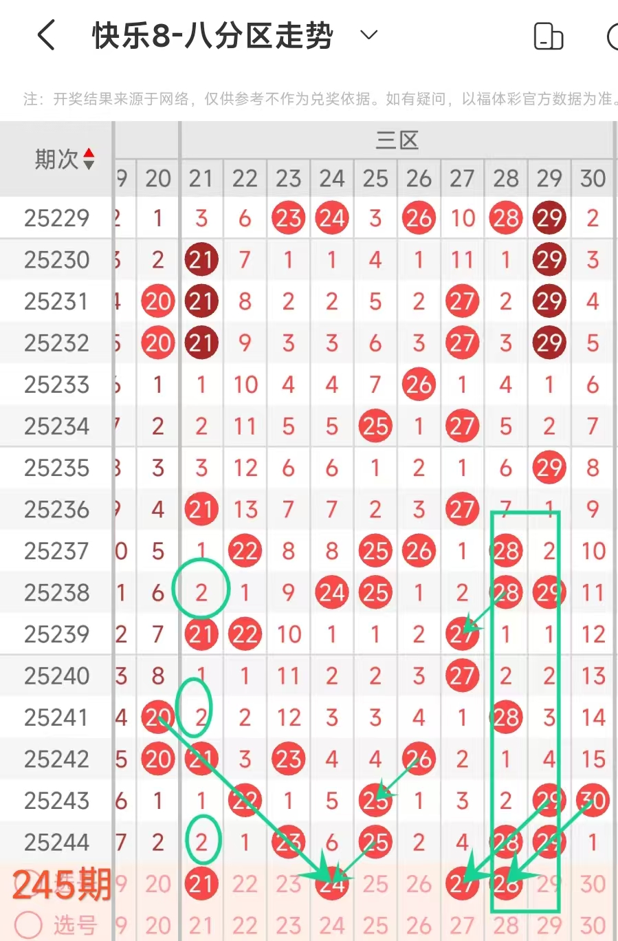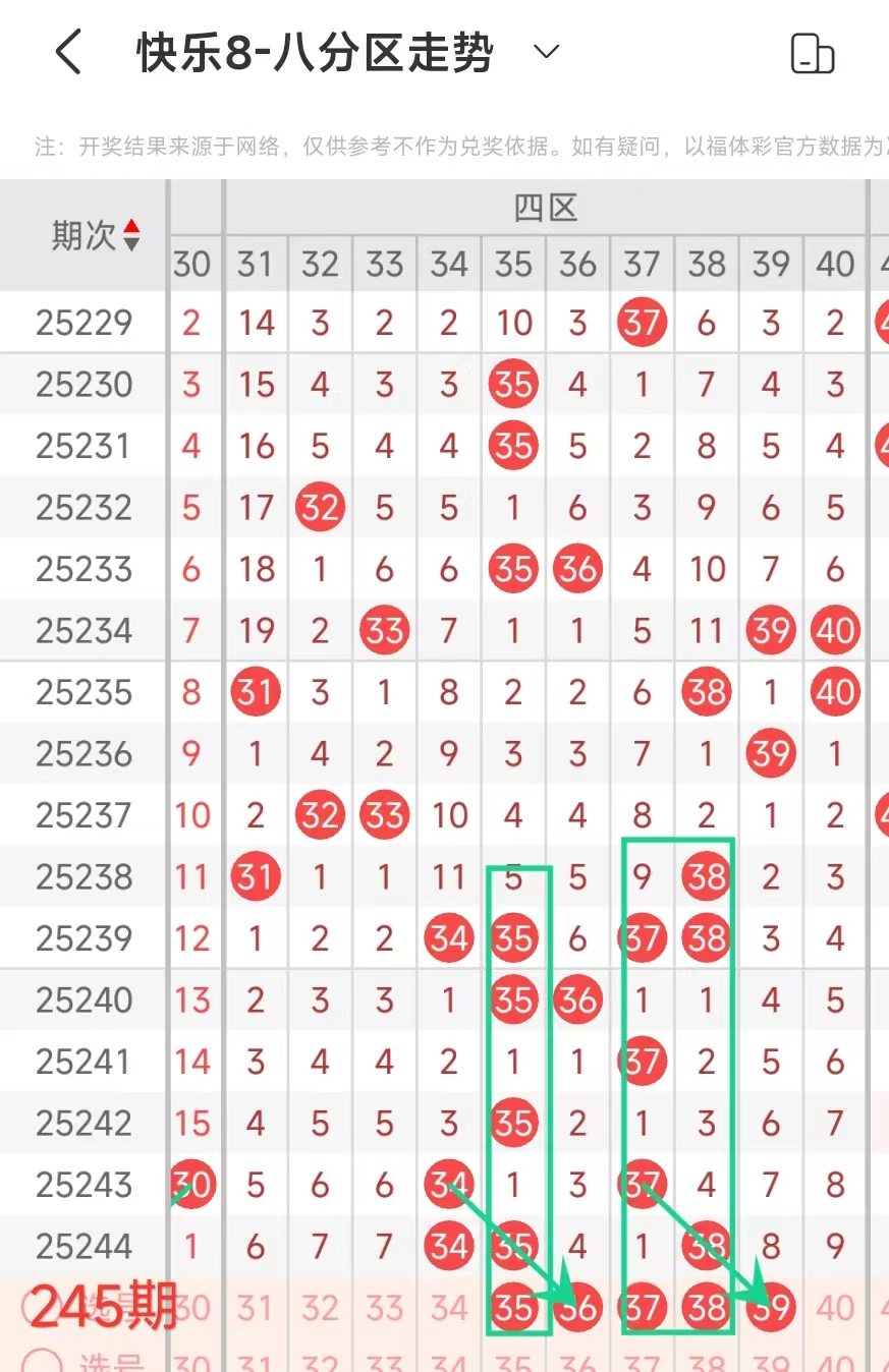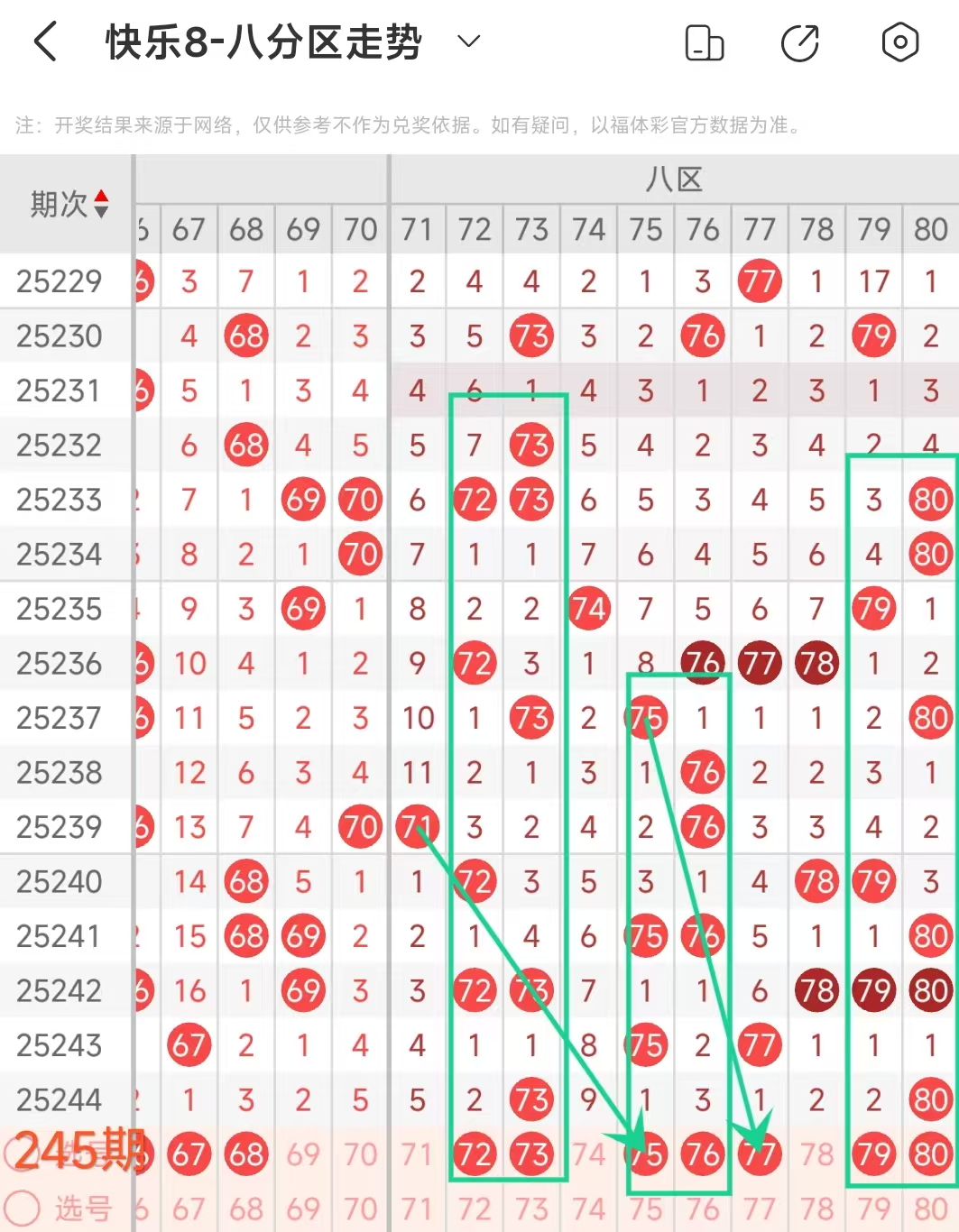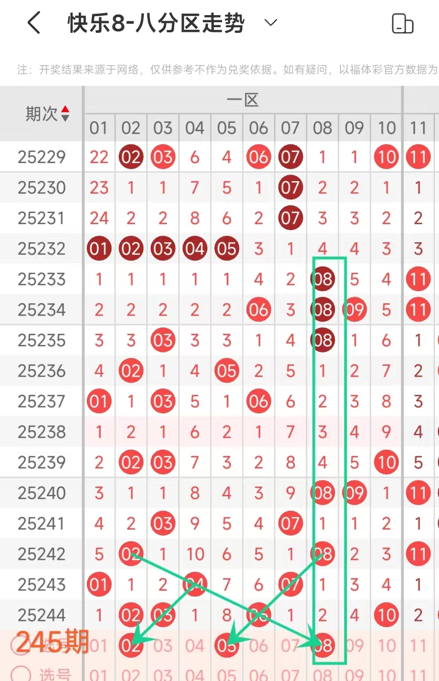 在快乐8的探索之旅中,通过对开奖走势图细致入微的观察,我们总结出一些具有参考价值的规律。几乎每一期开奖号码都呈现出以下显著特征:其一,大概率出现连号;其二,常常伴有边码;其三,遗漏值为1 2 3的号码频繁现身;其四,重号现象也较为常见。掌握这些要点,能为我们的投注提供方向指引。我们约定采用八分区走势图来展开分析。