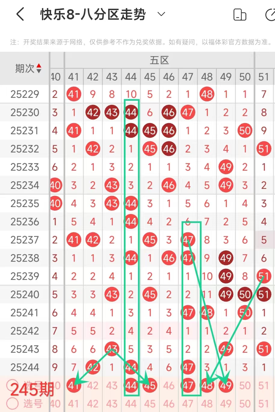 上期五区开 42 44 47这3个号码,本期该区应该出号2个左右