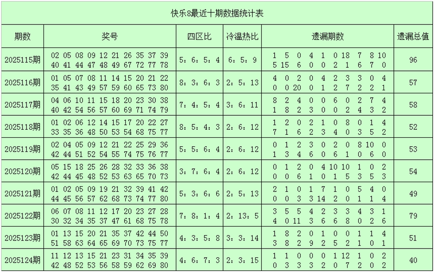 一、快乐8第2025125期奖号分析(定义:遗漏0-2期号码为热码,遗漏3-6期号码为温码,遗漏7期及7期以上号码为冷码,重码为上期开出奖号,邻码为上期没有出现,但与上期奖号差值为1的号码,例如上期开出奖号04,没有出现号码03和05,则本期03和05都为邻码,其它则为孤码。