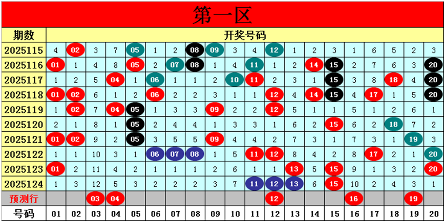 目前第一区包含10个热码:重码4个11、12、13、15,邻码1个20,孤码5个01、06、07、08、17;包含7个温码:邻码1个14,孤码6个02、04、05、09、18、19;包含3个冷码:邻码2个10、16,孤码1个03;号码冷温热个数比为3:7:10,重号、邻码、孤码个数比为4:4:12。