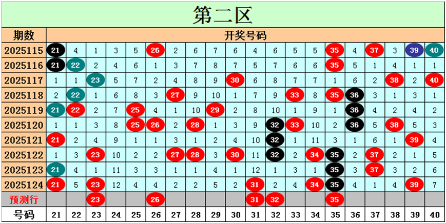 目前第二区包含11个热码:重码6个21、23、31、34、35、39,邻码2个30、32,孤码3个27、28、37;包含7个温码:邻码4个22、33、36、38,孤码3个25、26、29;包含2个冷码:邻码2个24、40,孤码0个;号码冷温热个数比为2:7:11,重号、邻码、孤码个数比为6:8:6。