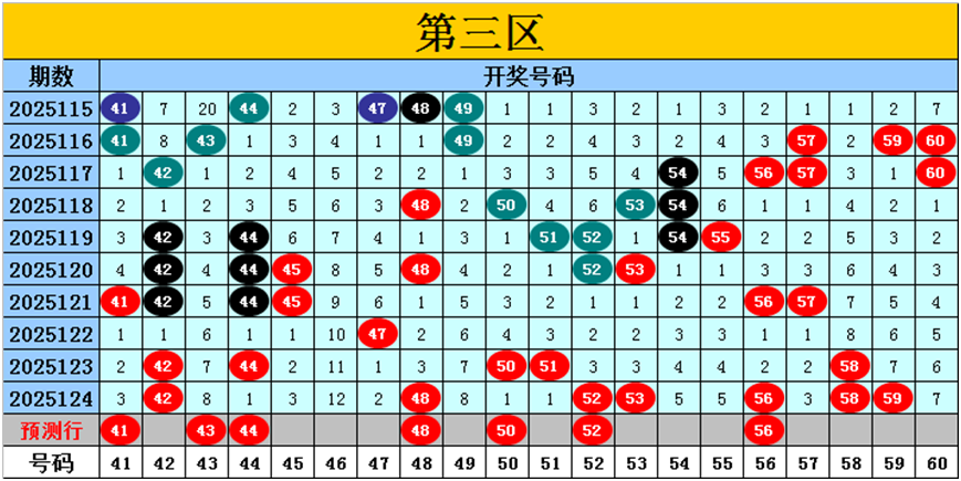 目前第三区包含11个热码:重码7个42、48、52、53、56、58、59,邻码2个47、51,孤码2个44、50;包含5个温码:邻码4个41、54、55、57,孤码1个45;包含4个冷码:邻码3个43、49、60,孤码1个46;号码冷温热个数比为4:5:11,重号、邻码、孤码个数比为7:9:4。
