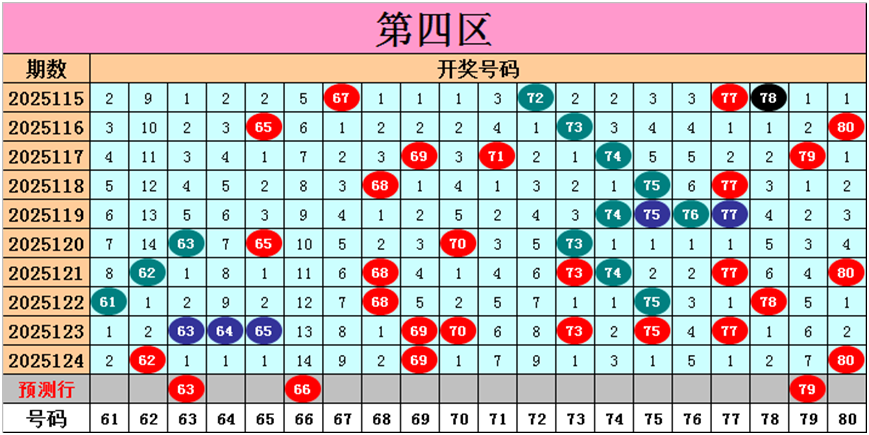 目前第四区包含13个热码:重码3个62、69、80,邻码4个61、63、68、70,孤码6个64、65、73、75、77、78;包含2个温码:邻码0个,孤码2个74、76;包含5个冷码:邻码1个79,孤码4个66、67、71、72;号码冷温热个数比为5:2:13,重号、邻码、孤码个数比为3:5:12。