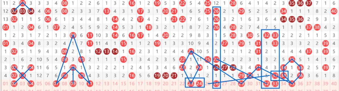 【第一区间1-40】上期开出13个号码。本期分析推荐:02-04-07-09-11-23-24-26-29-32-33-35十二个号码。02-04梅花走势;07-09-11为很完整的金字塔形态;23-24为3、4尾斜连三期重点号码,与3、4字头3、4尾形成阶梯等距同尾形态号码;26为1-2-3形态走势,本期还继续看好26和62(同出概率较大)形成如影随形出号态势;29同路、斜连均有走势,同时9尾三斜连;32同路三期、斜连四期,与同路三期、斜连四期33组成对子上下对称;35斜连、夹号;在第二小区间形成同路号整体走势。区间推荐重点号码:一小区间07-09-11,二小区间23-24-33。