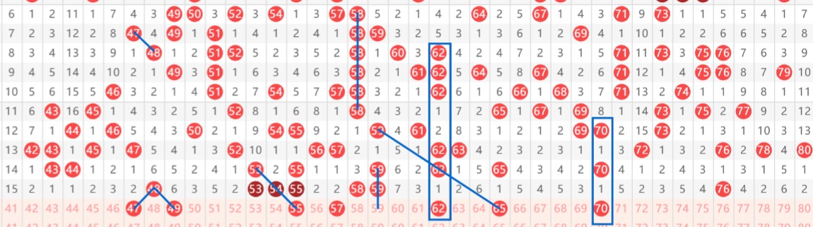【第二区间41-80】:上期开出7个号码。本期推荐:47-49-55-57-62-65-70七个号码。47、49从分边号码考虑,再者47、07关联紧密号码,考虑同出形态,49为9尾三斜连;55四斜连和三重形态号码;57斜连形态,同时考虑区间同尾出号形态;62为1-2-3形态走势,本期还继续看好26和62(同出概率较大)形成如影随形出号态势;65同路三期号码;70遗漏一期等距号码,为常见出号形态。区间推荐重点号码:三小区间47-55-57,四小区间62-65-70。