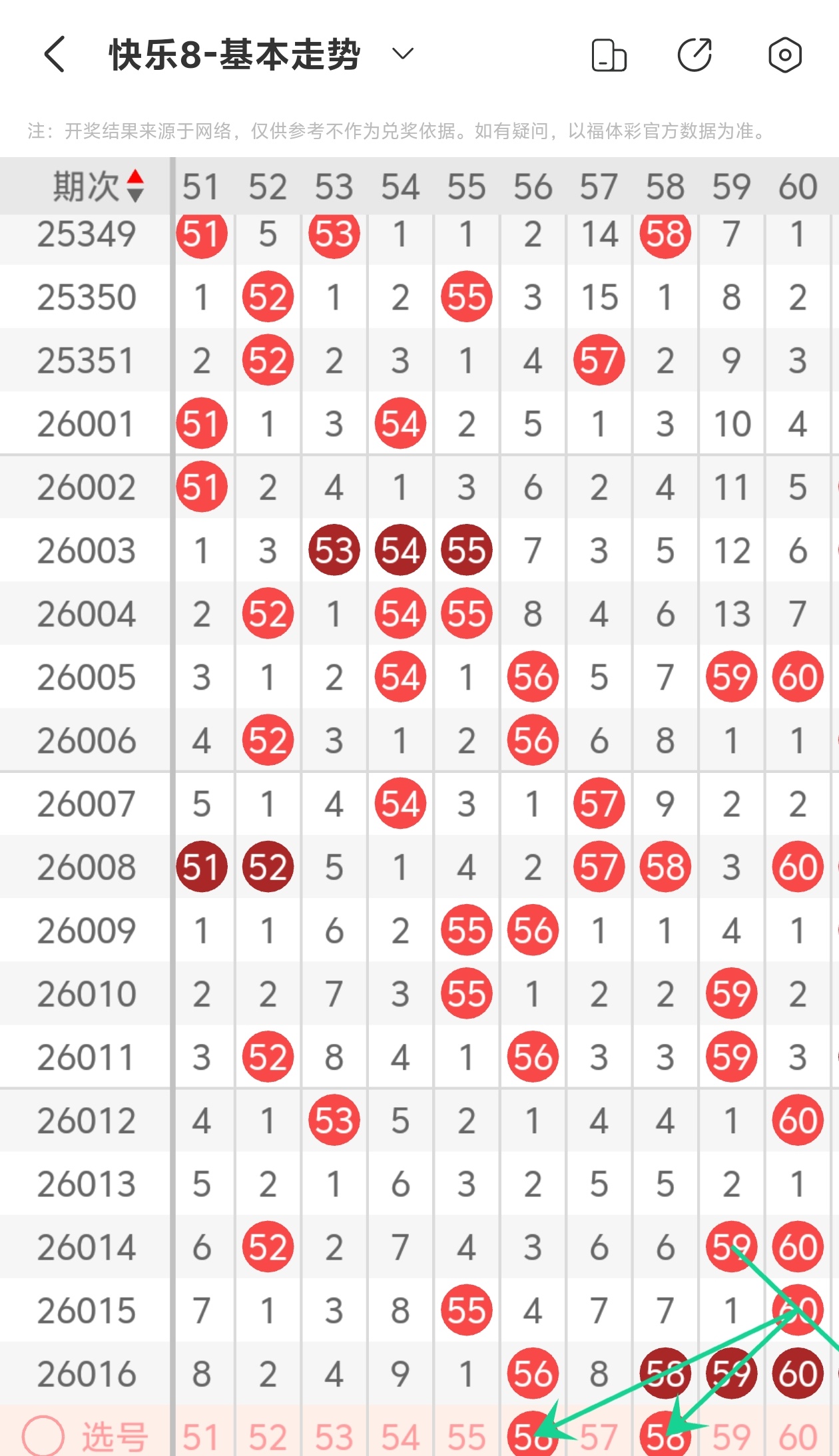 上期第六区间开出56 58 59 60,56为斜连走势,58为重码带斜连走势,本期推荐56 58