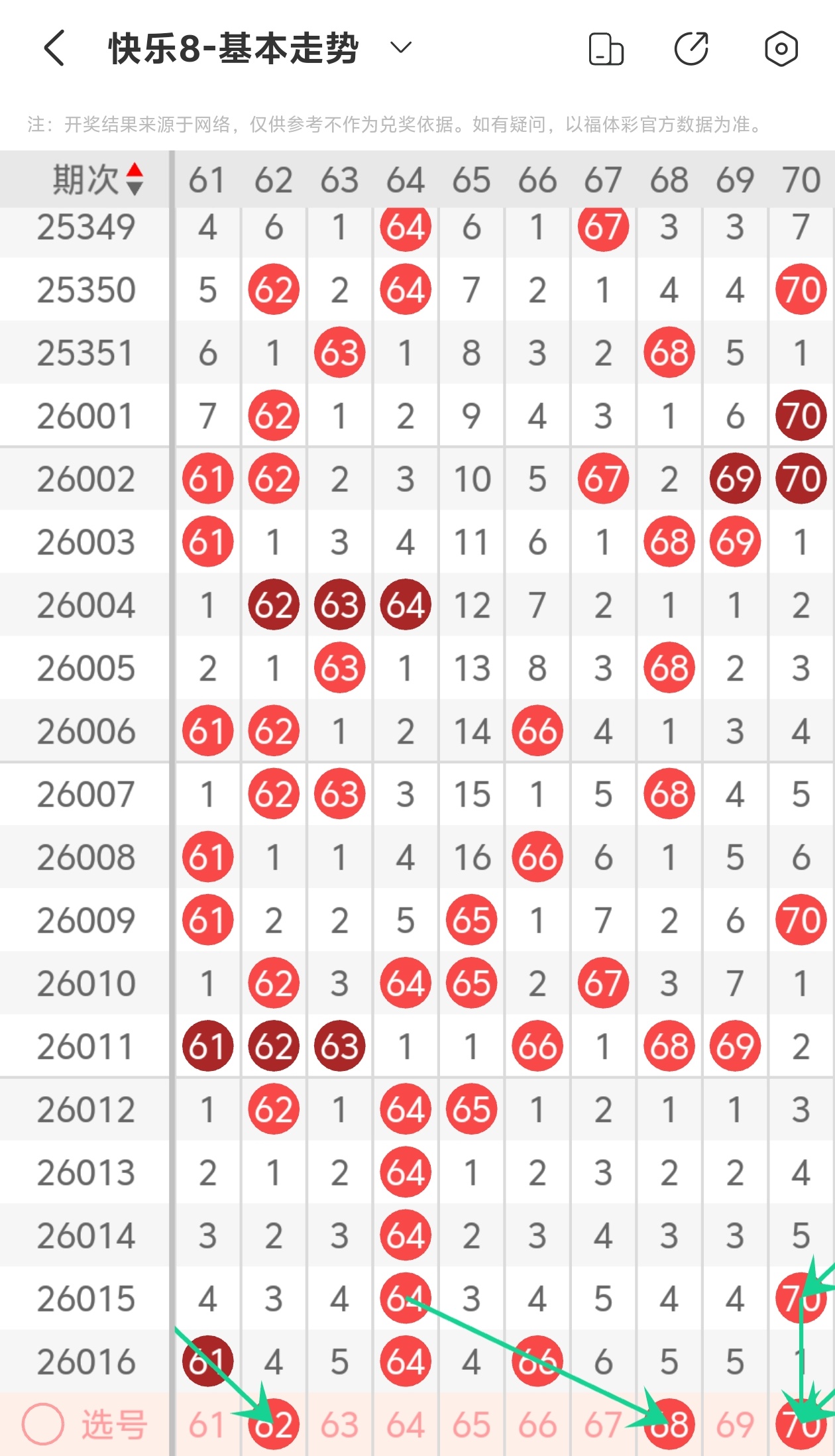 上期第七区间开出61 64 66,62为斜连走势,68为斜连走势,本期推荐62 68
