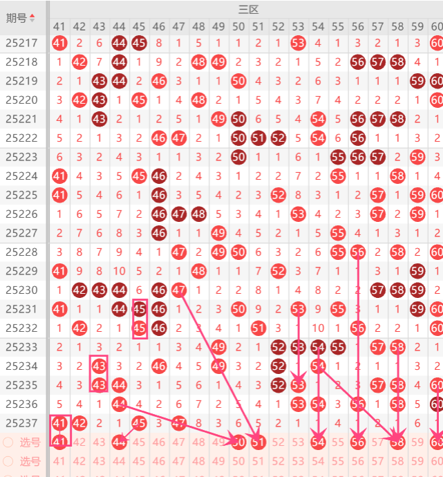 而三区重点关注的号是41.43.45.51.54.59.60中参考3码开出机会,切记只是参考