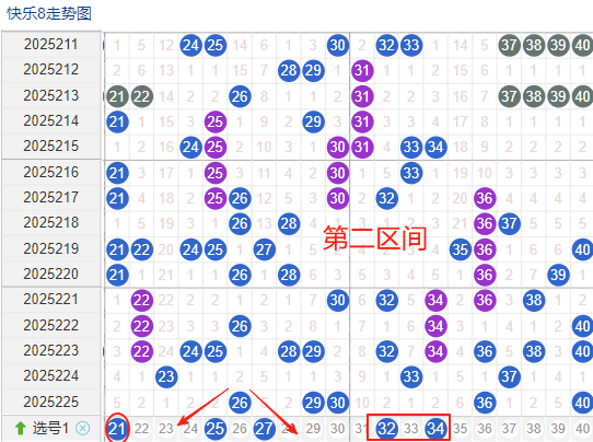 上期二区开出5个奖号(26.29.30.36.40)上期回顾二区开出5个奖号二区间在上期落位同比前期的话呈现了一个递增的落位趋势,先来看本期号码21整体活跃度较,在近 30 期里有一定的间歇性出现,不是每期都开,整体走势还是很稳定号码出现的频次也是很稳定。号码25近期热度较热,间隔性也还是很稳定,说明其在当前阶段活跃度较注意防守。号码32近期活跃度较,有一定的间歇性近期整体走势相对还是很平稳有特别明显的冷热趋势变化,号码3430期内活跃度较温热有明显的连续出现形态走势,近期整体表现比较温热