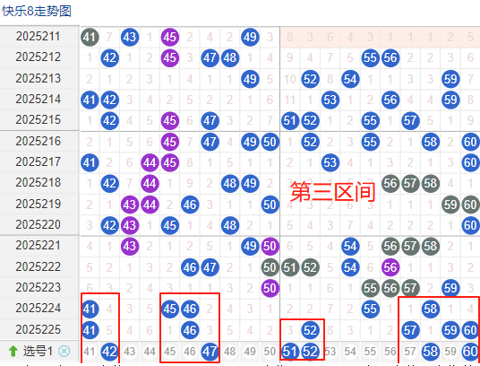 三区间开出了6个奖号(41.46.52.57.59.60)上期回顾三区开出6个奖号上期的三区间的奖号数量呈现一个递增的形态,4头回补2个5头回补2个,本期先来看号码42近期出现频率相对来说可以的。偶尔有时间隔期数也是很长,说明其在近期的开奖中较,号码47在近 30 期内出现次数是很稳定的号码,近期的活跃度也比较稳定一点。号码52有一定的间歇性,通常间隔5-3期会出现一次,有明显的连续出现态势,走势相对较稳定,在整个第三区间的表现可以防守的。号码58走势相对近期比较热,近期有连续间隔落号的情况,活跃度近期处于跳跃态注意防守。