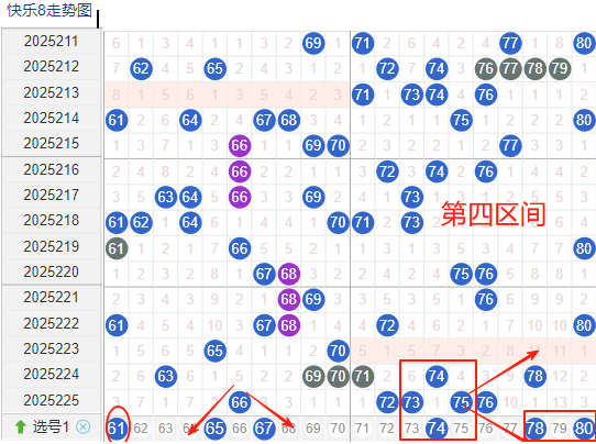 上期四区间开出了5奖号(66.72.73.75.76上期的四区开5个奖号呈现了一个递减的趋势,开出的奖号7回补4个6头回补1个,先来看号码61在近 30 期内属于一个不是很稳定的号码,但是近期出现频率相对来说还是一般,偶尔会间隔多期后出现一次,这个号码要注意防守,号码65有一定的间歇性活跃度较比如有时会间隔 3到5期就再次出现,也有时会间隔多期,近期整体出现频率比较,近期还是要关注的.号码74活跃度近期比较,有一定的间歇性。活跃度近期算稳定,整体走势有一定的波动性.