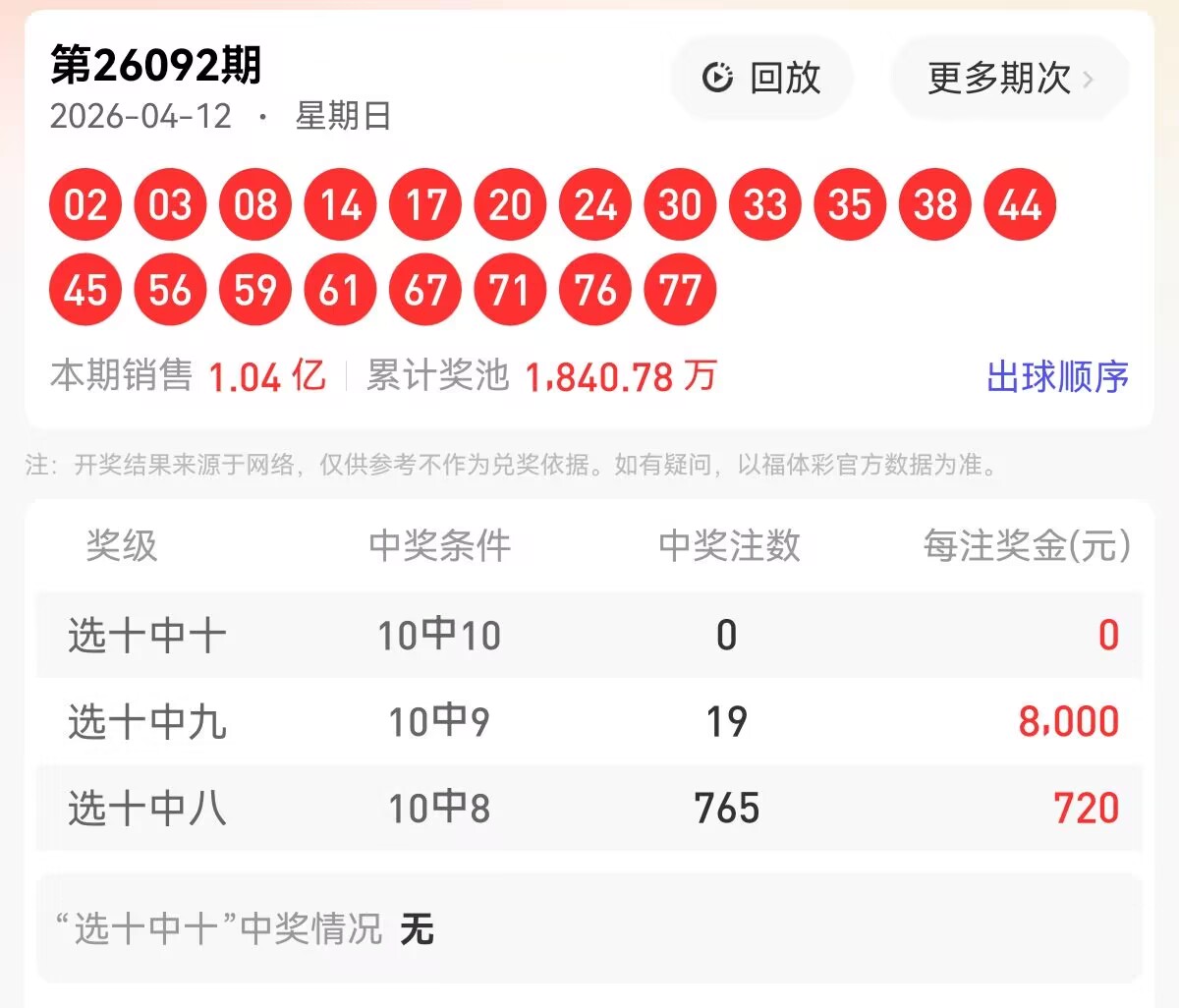 上期福彩快乐8第 2026092期开奖号码为【02 03 08 14 17 20 24 30 33 35 38 44 45 56 59 61 67 71 76 77】,其中大小比9:11,奇偶比为10:10,和值为780,跨度75,四区间比为6:5:4:5。下面是对本期对于每个号码的详细分析。