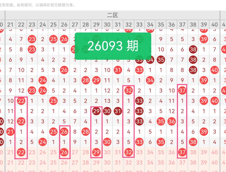 上期第二区间开奖5个号码,本期可能会稳定开出。22作为二区前段偶数号码,走势温和,前期虽未频繁开出,但整体走势处于稳步回升状态;26与22形成偶数联动,处于二区中段位置,两个号码间隔适中,有效覆盖二区前半段出号区域,避免号码过于集中。29为奇数号码,处于二区中段偏后位置,是近期走势较为稳定的温号,奇偶搭配上平衡整体区间比例,走势连贯且无异常波动;32属于二区后半段偶数,数值大小适中,与29形成奇偶交错,衔接中段与后段出号点位,让区间选号更具层次感。37作为二区偏大号码,靠近区间尾部,走势活跃性持续提升,补齐二区后段选号短板。