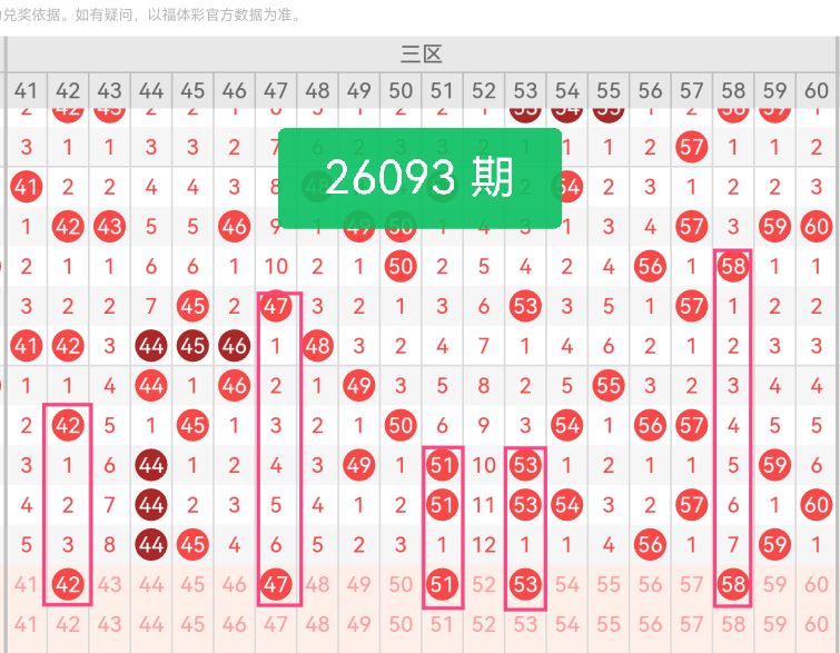 上期第三区间开奖个4号码,本期可能会增加开出。42作为三区开头的偶数号码,走势平缓,是区间前端的基础号码,能牢牢锁定三区起始出号点位,避免前端选号空缺;47为奇数号码,处于三区前段偏中位置,与42形成奇偶搭配,走势活跃度适中,贴合三区前段整体出号节奏,二者配合覆盖三区前半段区域。51、53均为三区中段奇数号码,两个号码相邻且走势高度联动,属于近期表现稳定的号码,聚焦三区核心出号区域,抓住区间中段高频出号的特点,提升选号针对性;58为三区后半段偶数号码,靠近区间尾部,走势处于平稳回升阶段,补齐三区后段出号覆盖。