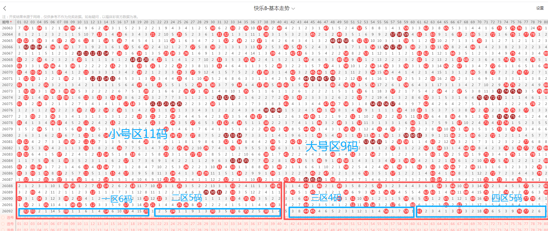 上图是快乐八2026092期区间走势图,从图中看到小号区(1-40)开出11个出奖号码,从开出数量上看与上期开出数量减少,热度上降温,从小号区近10期出号情况看,整体小号区前区近期偏温趋势;大号区(41-80)本期开出了9个出奖号码,从开出数量上看与上期开出数量增加,热度升温,从近期出奖号码个数看属于偏温态势,下期快乐八2026093期大号区号码大概率热度回温反弹,大小区间主看大区号码热度回温概率较大,大小比具体区间比可参考12:8,防10:10的比例;再从细分区间来判断,按走势图四分区分成四个区间,一区(1-20)开出来的号码有6个;二区(21-40)开出来的号码有5个;三区(41-60)开出来的号码有4个 ;四区(61-80)开出来的号码有5个;数据上看本期出奖号码集中分布在6区。从号码落位区间形态上看,快乐八2026093期主看二、三区热度回暖的态势,落号几率较大,建议密切关注。