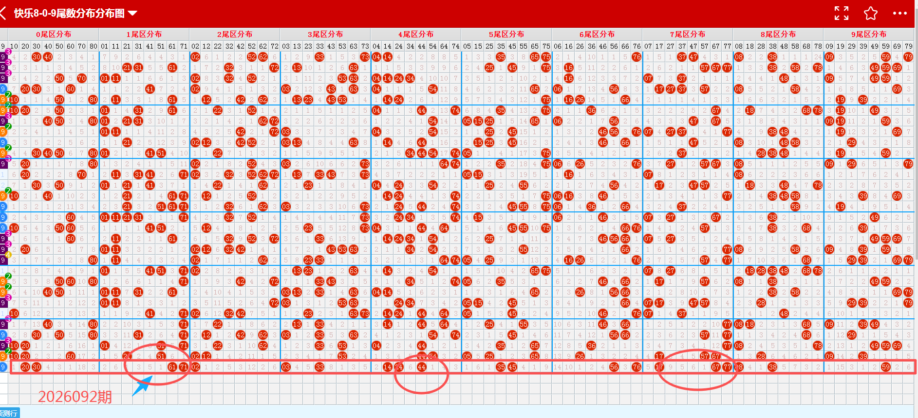 上图是快乐八2026092期的尾码走势图,从图中看0尾到9尾出号个数依次是:0尾号码区开出2个;1尾号码区开出2个;2尾号码区开出1个;3尾号码区开出2个;4尾号码区开出3个;5尾号码区开出2个;6尾号码区开出2个;7尾号码区开出3个;8尾号码区开出2个;9尾号码区开出1个;再看小尾号码(0尾-4尾)区有10码,大尾号码(5尾-9尾)有10码;数据比对统计后可以看到本期4、7尾出号数量最多,一共开出了6个中奖号码。本期没有尾区出现断区!由走势比对推断2026093期重点需要关注1、4、7尾区号码下号热度回补和落号数量增加的概率较大。