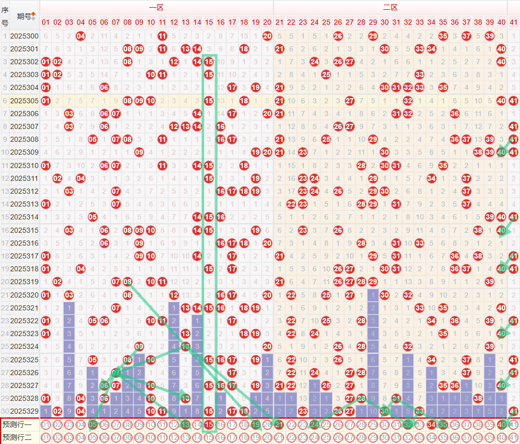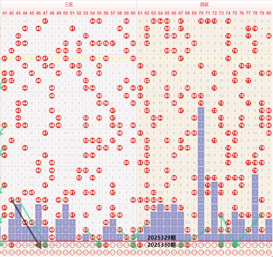如图所示:在本期大数区的选号中注意在上期的走势中三区间开出了7枚中奖号码,与一区间保持着同步高位走势,区间的多点位都保持着连续走势,本期注意41的下方开出分双边的40 42冷组合走势,在上期三区间尾部位置上期开出了59 60从四区间延续过来的二连走势,另外在上期的53的下方开出了与58 60 61相同的走势,因此本期要注意55 56与59 60开出相同形态号码,这里要注意与后段位置出现断点的走势,在上期中段位置开出了48重号二期的走势下方注意47 49的单边延续走势,四区间上期近开出了一枚中奖号码,落位在区间的最低位,在近短期内的走势中,四区间落号数量多见于奇数走势,在上期的开奖结果中四区间仅开出一枚中奖号码,且是奇数落号,因此本期要注意四区间的落号形态出现转换为奇数或者是偶数,也就是本期要重点关注四区间的奇数或者是偶数的单项选择。