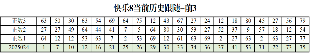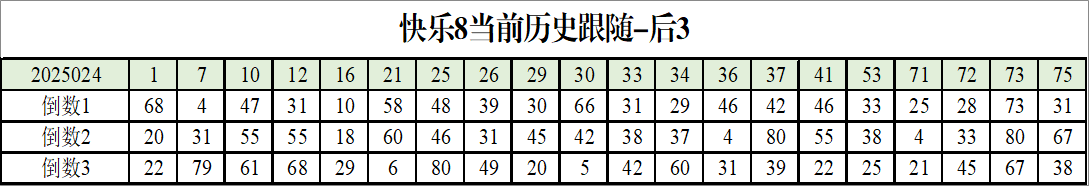 我感觉选热的同时,还要注意防冷条件开出,可以直接选取每个号码跟随出次前三的号码,也可以考虑把出次最后的三个数字加进去,不过这样可能号码太多,可以尝试。图上也能看出单独号码跟随的情况,我就不一一统计每个号码的出次了,我这里考虑提高概率,取每个号码历史跟随的前三号码和后三号码,根据2025024期的号码,我关注正数3和倒数3的号码号码为: