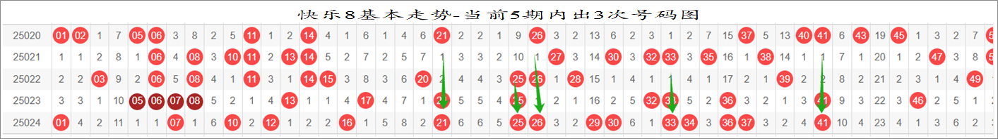 这个条件可以理解为追热号,主要是选取遗漏小于5期的号码来做大底,通过号码分布图我们也能看出,每期都有重复号,都有上期号码的相邻号,再仔细观察下面的部分分布图,2025024期,按照【号码(遗漏)】的方式统计出来是:1(3),7(0),10(2),12(4),16(4),21(0),25(0),........。可以看出遗漏小于5的号码比较常见,这就是一个大概率事件,我们就可以用这个梳理出一部分号码,用来作为我们交集的一组号码。