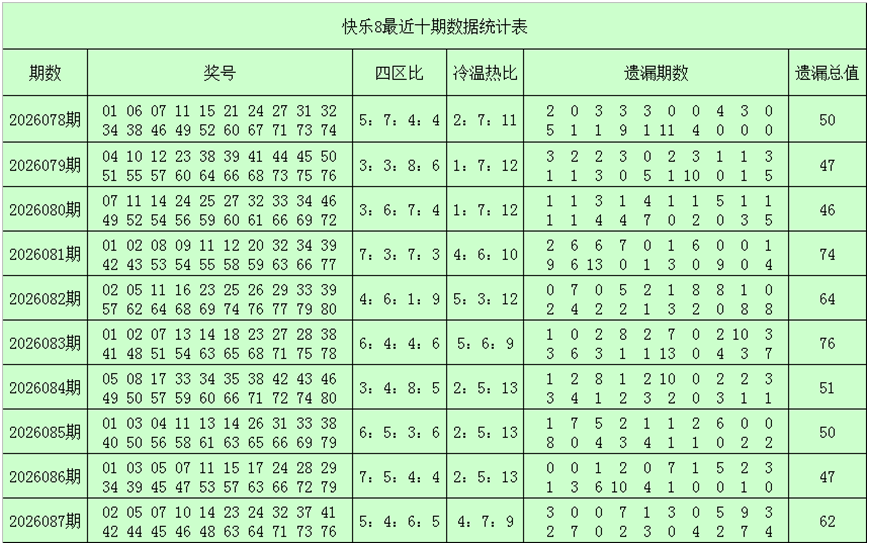 一、快乐8第2026088期奖号分析(定义:遗漏0-2期号码为热码,遗漏3-6期号码为温码,遗漏7期及7期以上号码为冷码,重码为上期开出奖号,邻码为上期没有出现,但与上期奖号差值为1的号码,例如上期开出奖号04,没有出现号码03和05,则本期03和05都为邻码,其它则为孤码。