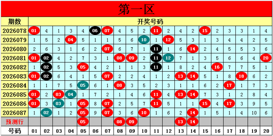 目前第一区包含12个热码:重码5个02、05、07、10、14,邻码6个01、03、04、11、13、15,孤码1个17;包含6个温码:邻码2个08、09,孤码4个12、16、18、20;包含2个冷码:邻码1个06,孤码1个19;号码冷温热个数比为2:6:12,重号、邻码、孤码个数比为5:9:6。