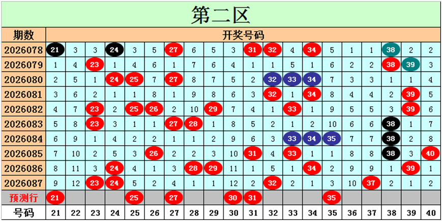 目前第二区包含13个热码:重码4个23、24、32、37,邻码4个31、33、38、40,孤码5个26、28、29、34、39;包含3个温码:邻码1个25,孤码2个27、35;包含4个冷码:邻码2个22、36,孤码2个21、30;号码冷温热个数比为4:3:13,重号、邻码、孤码个数比为4:7:9。