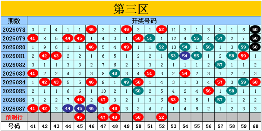 目前第三区包含12个热码:重码6个41、42、44、45、46、48,邻码1个47,孤码5个50、53、56、57、58;包含7个温码:邻码2个43、49,孤码5个51、54、55、59、60;包含1个冷码:邻码0个,孤码1个52;号码冷温热个数比为1:7:12,重号、邻码、孤码个数比为6:3:11。