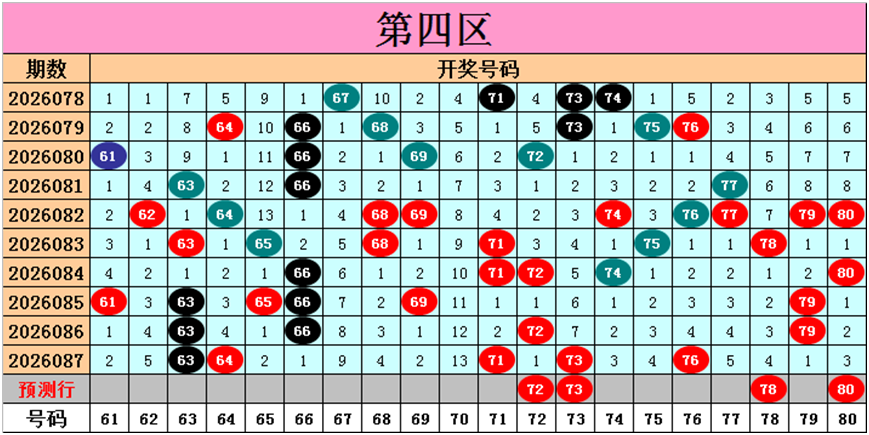 目前第四区包含11个热码:重码5个63、64、71、73、76,邻码2个65、72,孤码4个61、66、69、79;包含7个温码:邻码4个62、74、75、77,孤码3个68、78、80;包含2个冷码:邻码1个70,孤码1个67;号码冷温热个数比为2:7:11,重号、邻码、孤码个数比为5:7:8。
