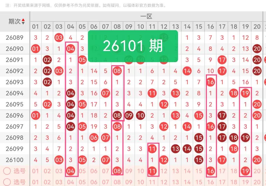 上期第一区间开奖7个号码,本期可能会减少开出。04、08是本区近期高频温码,近十期均有多次间隔开出,号码活跃度稳定,无长期断档情况,配热度回落阶段的平稳出号节奏。11、16属于本区阶段性温号,区间号码冷热差值持续拉大,已满足号码回补开出的条件。收尾号码19为一区边缘临界号,衔接二区号码走势,近期奇偶交替走势明显,奇数号码逐步回暖,可有效平衡本区奇偶出号比例。
