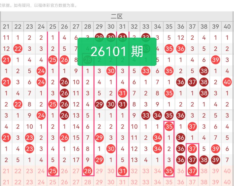 上期第二区间开奖5个号码,本期可能会稳定开出。25、28为二区前段核心温号,走势连贯性极强,近阶段出号间隔均匀,无大幅偏态走势,适配二区稳定出号的特性。31、35为区间中空补位号码,上期二区号码集中扎堆尾部,前段和中段存在明显号码空档,这两枚号码可精准填补区间空白,完善整体号码分布结构。37作为上期开奖落地热号,具备极强的重号延续惯性,历史数据中二区热号连开概率极高,是本期高概率核心号码。