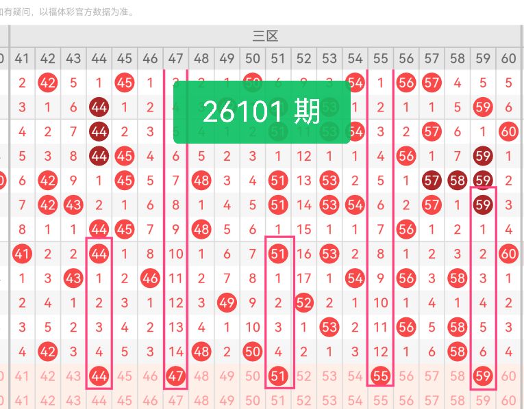 上期第三区间开奖个4号码,本期可能会增加开出。44、51为区间偶数优质温码,上期三区偶数号码出号占比偏高,偶数走势形成惯性,这两枚号码走势平稳,间隔出号频次规律。47、55、59为三区阶段性蛰伏奇数冷号,长期处于低频次出号状态,随着区间整体回暖,奇偶配比失衡的状态需要修正,奇数号码迎来绝佳回补机会。