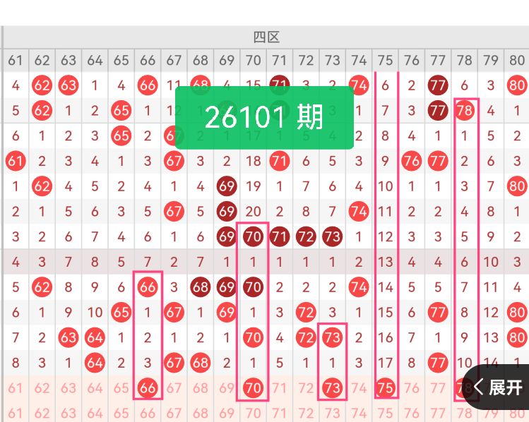 上期第四区间开奖4个号码,本期可能会增加开出。66、70是四区低位偶数温号,衔接三区大号走势,近期出号节奏稳定,以隔期形式开出,出号概率较高,是四区基础出号主力。73、75为四区中段奇数核心号码,上期四区奇数号码出号偏少,奇偶比例失衡,本期奇数号码存在明显回补需求。78为四区高位边缘收尾号,填补区间末尾号码空白,完善四区整体号码覆盖范围。