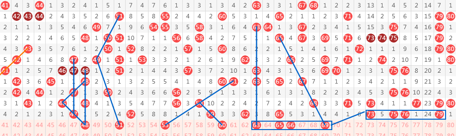 【第二区间41-80】:上期开出9个号码。本期推荐:48-51-53-55-60-63-65-66-69九个号码。48三斜连的回头号码,同时与47形态完全相同,重点号码,同时带出同路形态号码51;53同路号码,也为奇数连号,51-53以52分边来把握;55同路三期号,考虑与65同时开出趋势;60斜连三期号码,为遗漏3-2-2-3形态;63-65-66-69同路完整形态号码,形成上期7头同路的复制形态号码出号趋势,这种形态在四区间非常容易开出,试上一把。区间推荐重点号码:三小区间48-51-60,四小区间63-65-69。