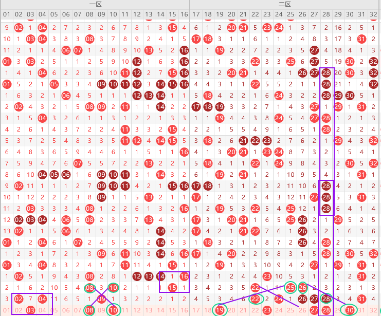 二区胆尾7尾,9尾,边号21 23 25 29 30 32出1-2码,重号22 24 26 27 28 31出1-2码,形态上19 26 30是斜连号,上图已勾画,缩小范围重号28是大明号,跟上面形态一样,已勾画,感觉看18合适,重号先看27, 其次24 28,3开头30 31 32应该有一码,防30,1开头不出号防一下17 18大概率有1码,结论关注五码18 25 24 27 30防23