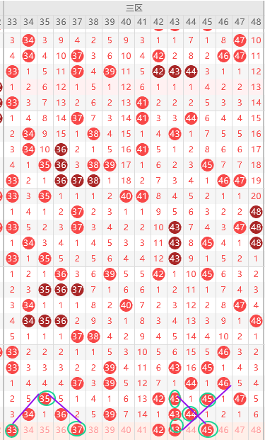 三区胆尾7尾5尾,边号33 35 37 42 43 45出一码,重号34 36 39 43 44出1码,形态上33 37 43 45是斜连号,上图已勾画,缩小范围,4开头走冷,本期大概率1-2码,42 45二出一,3开头35 37出一,重号先看36,近期斜连号大明号直接出,所以今天应该跟33 37 43 45应该有1码,结论关注五码 36 37 38 42 45
