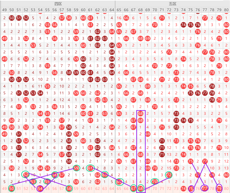 五区胆尾8尾9尾,边号66 69 71出一码,重号65 70二出一,形态上67 68 75 77 79是斜连号,上图已勾画,68 74最大遗漏值,最近要出,老规矩守2期,0尾最热出2期,重号先看65,其次70,67是斜连号正点位看,要看同尾号77,本期防守80,结论关注五码65 68 72 75 77防 80