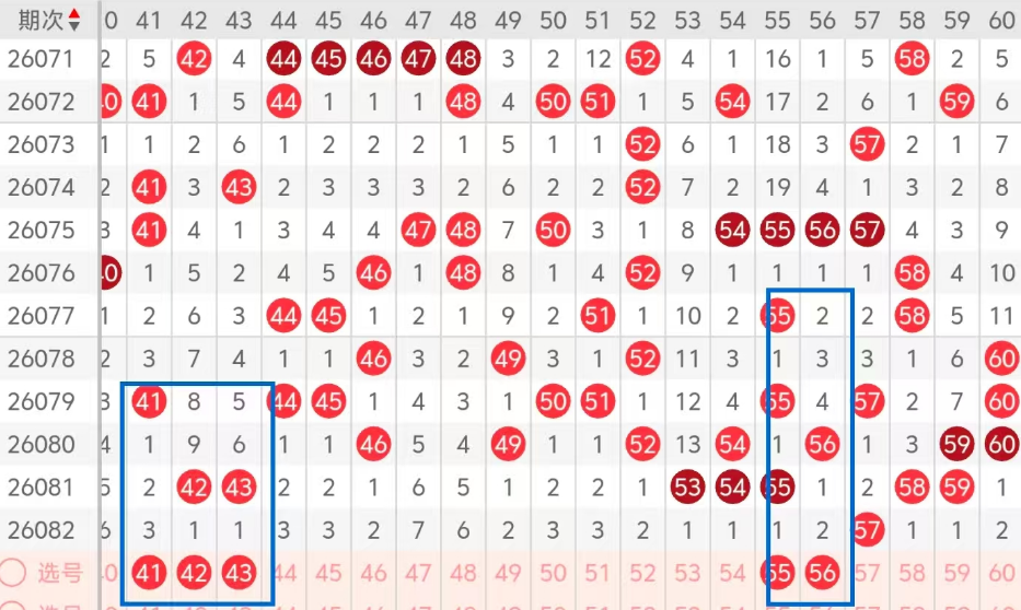 第三区间的走势分析:第三区间上期开出了一个号码球,主要的落号点位在三区间的后半区,走出了一奇的形态走势,上期三区间的前半区没有号码球落下,后半区落下了一个号码球,整个三区间处于走冷的趋势,根据三区间的走势规律,今天的三区间我们主看前半区龙头位置41 42 43三连码的落位,特别是42 43走出了和上面一样的对称形态走势,再看55 56边码姊妹对的落位,也是大斜连码的落位,这五个号球建议大家打个五码单式,或者打个五码复四比较稳妥,参考为主!