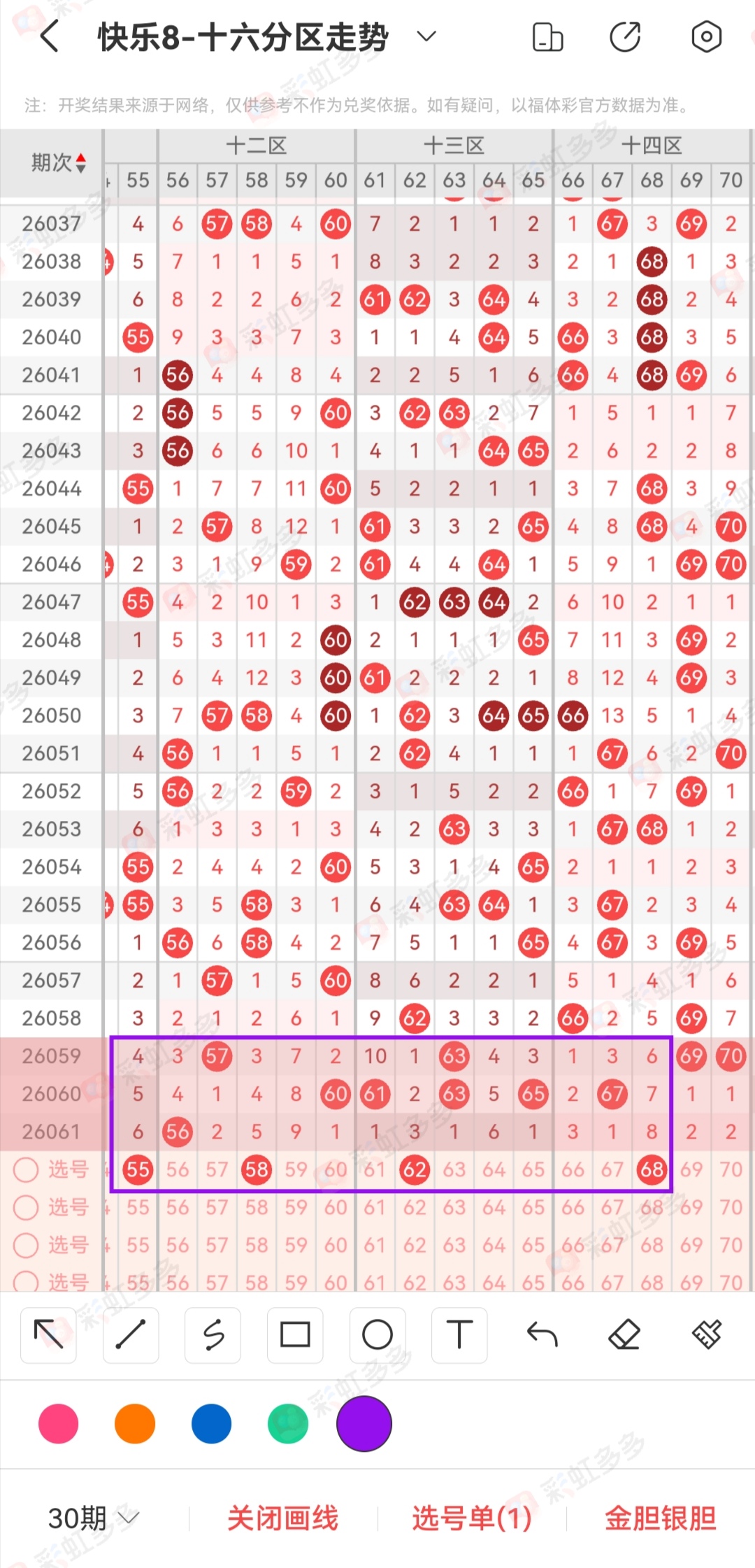 第三个点就说一下整体看法,大家估计都在盯着重号数据,这里说白了不值得,不要考虑说重号不多一下递增。我们经历过10码走重,但是这种情况都是极端,且近期的状态走势区间容易形成的是区间走热,比方说20个号码开出8码9码。我们要抓的是热态,而不是考虑走重,相对于重号来说,确实20码比较少,但是叠加考虑你要看的却是20+80码,所以这里不值得过度研究,每个号码的牵扯点太多了,所以格局打开。让一些不确定得位置多发挥。比方说今天的41-50,我是一点儿想法没有,不出意外今天还是能够开出4码左右。