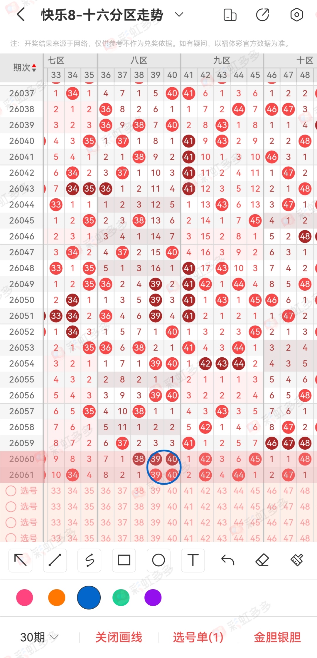 第二个点是这里的的3连号码,基本考虑能够发现,38 39 40历史形态出现过这样的。当然了,查看数据,我想肯定还会有比较更专业的,目前我已知的就是有专业的团队考虑周期,百期延伸,通过基本定位画走势图,或者自定义公式计算号码。条条大路通罗马,所以相信自己。我的想法就是这里的3连走2重有机会继续回到3重。所以这里的点位多多少少考虑一个。不要说39 40继续走重忽略38。或者说3连过渡顺位也是要小心的。3头的点位尤其是后区,38 39 40 41。这个是比较爱出的,而且4连也是打对过。